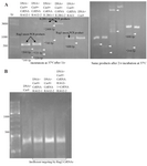 Figure 2. In vitro DNA cleavage using Cas9 nuclease and crRNAs (CRISPR RNP). A) Cas9 nuclease and crRNAs for targeting RAG1, RAG2 and IL2RG genes. Left: incubation at 37°C after 1 hr. Lane1, 2: first bands are the Rag2 uncut PCR products, second and third bands are cleaved fragments represented by white arrows. Lane 3, 4: first bands are the IL2RG uncut PCR products, second and third bands are cleaved fragments represented by white arrows. Lane 5: first band is the Rag1 uncut PCR product, second band is one of the cleaved fragments, another cleaved fragment of Rag1 disappeared on agarose gel electrophoresis but after 2 hr, a faint band was found. Lane 6: Rag1 PCR product as a DNA control. Right: incubation at 37°C after 2 hr. The lanes are in the same order just after 2 hr. B) Cas9 nuclease and crRNAs for targeting RAG2 genes after 6 months of shelf life. Very faint bands show inefficient targeting by Rag2 crRNAs. In all agarose gel pictures, bands resolution is not brilliant due to low quality of GelRed.