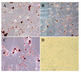 Figure 6. Adipogenic differentiation after 21 days. In adipogenic cultures, formation of lipid droplets within the cytoplasm of the cells was quite slow and were gradually occupied the whole cells. Accumulation of intracellular lipid droplets was determined as red loci following oil red O staining in bone marrow, A) Liver; B) and adipose tissue; C) derived MSCs (400×). No stained foci were observed in non induced cell cultures; D) (200×)