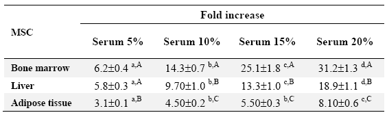 Table 3. The effect of serum concentration on proliferation of mescnchymal stem cells derived from different sources a-d) Numbers with different lowercase superscript letters in the same row differ significantly (p<0.001) A-C) Numbers with different uppercase superscript letters in the same column differ significantly (p<0.001)