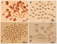 Figure 1. A) Immature germinal vesicle (GV) oocytes isolated from 4-6 week-old mice 48 hr after injection with 5 IU pregnant mare serum gonadotropin (PMSG), enclosed with or without compact cumulus cells (Scale bar: 50 μm). B) GV oocytes at 24 hr of culture with distinct first polar body (Scale bar: 50 μm). C) Developed 2-cell and D) Blastocyst embryos obtained from fertilized GV oocytes cultured in potassium simplex optimization medium (KSOM) (Scale bar: 50 μm).