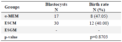 Embryonic viability rates at 17.5 days after embryo transfer to pesudopregnant recipient mice were evaluated (Table 1). As seen in table 2, no significant difference existed between successful birth rates for α-MEM (47.05%) and ESCM (40%; p=0.8703).