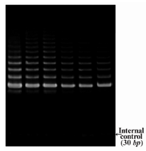 Figure 5. Effect of lentinan on hTERT gene expression (Lanes 1 through 6 represent 0, 2, 4, 6, 8 and 10 ug/ml lentinan concentrations at which DLD-1 gastric cancer cell lines were incubated; M is molecular weight marker)