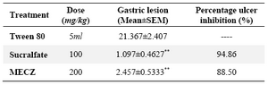 Table 3. Effect of methanol extract of C. zeylanica (MECZ) on indomethacin induced ulcer in rats