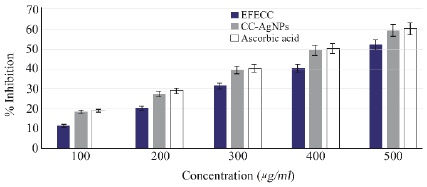 Figure 6. DPPH free radical scavenging potential was observed to be EFECC >CC-AgNPs> ascorbic acid and the %inhibition was increased dose-dependently.