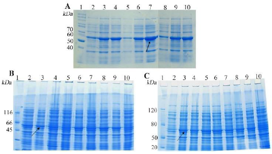 Figure 1. SDS-PAGE evaluation the total expression of E. coli BL21 (DE3) containing recombinant pTWIN1in various conditions. A) analysis of total LYC1 fusion protein expression. Lane 1: PageRuler™ unstained protein ladder 26614, Lane 2: induction by 0.1 mM IPTG at 7ºC, Lane 3: induction by 0.3 mM IPTG at 7ºC, Lane 4: induction by 0.5 mM IPTG at 7ºC, Lane 5: induction by 0.1 mM IPTG at 22ºC, Lane 6: induction by 0.3 mM IPTG at 22ºC. Lane 7: induction by 0.5 mM IPTG at 22ºC. Lane 8: induction by 0.1 mM IPTG at 37ºC. Lane 9: induction by 0.3 mM IPTG at 37ºC. Lane 10: induction by 0.5 mM IPTG at 37ºC. B). analysis of total TP4 fusion protein expression. Lane 1: PageRuler™ unstained protein ladder 26614, Lane 2: induction by 0.1 mM IPTG at 7ºC, Lane 3: induction by 0.3 mM IPTG at 7ºC, Lane 4: induction by 0.5 mM IPTG at 7ºC, Lane 5: induction by 0.1 mM IPTG at 22ºC, Lane 6: induction by 0.3 mM IPTG at 22ºC. Lane 7: induction by 0.5 mM IPTG at 22ºC. Lane 8: induction by 0.1 mM IPTG at 37ºC. Lane 9: induction by 0.3 mM IPTG at 37ºC. Lane 10: induction by 0.5 mM IPTG at 37ºC. C) analysis of total TP4 fusion protein expression. Lane 1: PageRuler™ unstained protein ladder 26614, Lane 2: induction by 0.1 mM IPTG at 7ºC, Lane 3: induction by 0.3 mM IPTG at 7ºC, Lane 4: induction by 0.5 mM IPTG at 7ºC, Lane 5: induction by 0.1 mM IPTG at 22ºC, Lane 6: induction by 0.3 mM IPTG at 22ºC. Lane 7: induction by 0.5 mM IPTG at 22ºC. Lane 8: induction by 0.1 mM IPTG at 37ºC. Lane 9: induction by 0.3 mM IPTG at 37ºC. Lane 10: induction by 0.5 mM IPTG at 37ºC.
