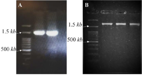 All fragments were amplified in a final reaction volume of 25 µl using PCR Master Mix (Ampliqon, A140303) and 0.6 mol/L of each primer, along with 30 ng of DNA. The MgCL2 final concentration was 1.5 mmol/L. The fragment-1 PCR cycling parameters were as follows: initial denaturation of 95°C for 5 min, followed by 30 cycles of 95°C for 30 s, 70°C for 30 s, 72°C for 60 s, and a final extension of 72°C for 5 min. The fragment-2 cycling parameters were as follows: initial denaturation of 95°C for 5 min, followed by 35 cycles of 95°C for 30 s, 64°C for 30 s, 72°C for 90 s, and a final extension of 72°C for 7 min. All PCR products were controlled by Agarose gel electrophoresis (Figure 2).