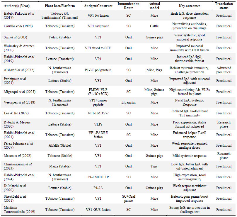 Clinical development stage of candidate vaccines: A comprehensive review of published studies indicates that most plant-based recombinant vaccines for FMD have not progressed beyond the preclinical stage. Experimental evaluations to date have primarily involved murine models, guinea pigs, and target livestock species such as cattle, sheep, and pigs 11,22,30. These studies have consistently demonstrated the ability of plant-derived VLPs, VP1 constructs, and synthetic epitopes to induce antigen-specific IgG responses and partial to full protection following viral challenge.