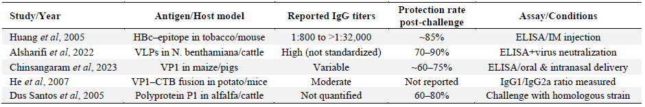 Immune response profiles: Limitations to meta-analysis: Substantial variation in immunogenicity outcomes across studies on plant-based FMD vaccines precluded a formal statistical meta-analysis. Several studies have demonstrated the ability of plant-derived antigens to elicit humoral immune responses in animal models. For example, Huang et al 28 reported robust IgG responses following immunization with epitope–HBc fusion proteins expressed in transgenic tobacco, with titers ranging from 1:800 to over 1:32,000 depending on dose and schedule. Similarly, Alsharifi et al and Veerapen et al documented promising results using VLPs expressed in N. benthamiana, yet they noted wide inter-study variability in both immunoglobulin titers and protection outcomes 6,11.