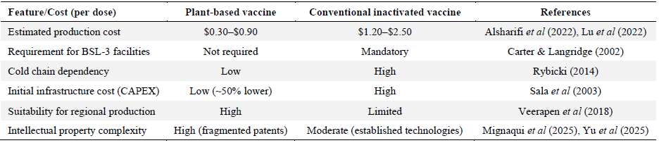 Economic modeling of plant-based vs. conventional FMD vaccines: A limited number of studies have attempted to quantify the economic advantages of plant-based recombinant vaccines over conventional inactivated FMD vaccines. Existing models suggest that, once scaled, plant-based systems may offer competitive cost structures, particularly in regions where cold-chain logistics and high biosafety containment add substantial cost to traditional vaccine manufacturing 7,32.