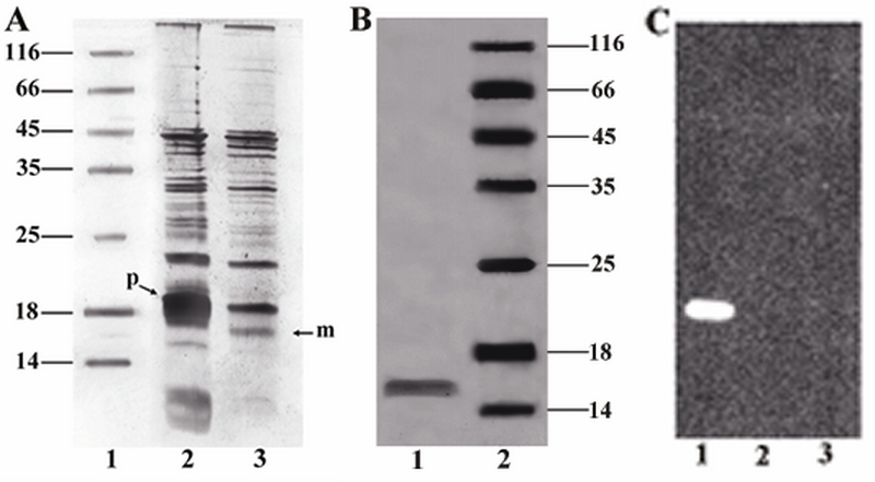 Figure 4. A) SDS-PAGE analysis of the periplasmic extract and cell-pellet fraction. Unprocessed pre-protein (~18 kDa) and processed mature protein (~16 kDa) are indicated as (p) and (m) respectively. Lane 1, Protein marker SM0671; lane 2, Cell-pellet fraction; lane 3, Periplasmic extract, B) SDS-PAGE analysis of the purified protein. Lane 1, Concentrated purified mutant; lane 2, Protein marker, C) Western blot analysis of the mutant, Lane 1: purified mutant; lane 2: Protein marker; lane 3:pre-induction sample as negative control