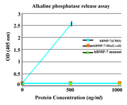 Figure 5. Alkaline phosphatase release assay. The purified monomer did not show any significant biological activity similar to the commercial BMP-7-His. As positive control, commercially available rhBMP-7 produced in CHO cells was used. Each value is the mean of triplicates shown±SD
